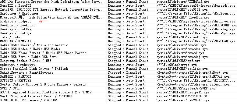 安全模式下 用SRENG扫 发现驱动项里有 服务名 hidproc / hidproc 状态 Running /Auto Start