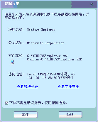 瑞星防火墙提示资源管理器试图连接网络