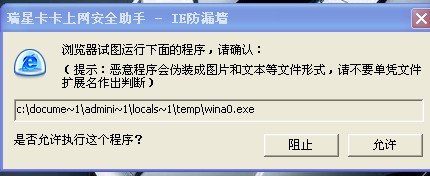 昨天上网,IE开下来以后,就一直跳这个,总是阻止不了.瑞星提示是阻止了,可是总是跳出来,很烦.能不能告诉下到底怎么样才能不让它跳出来,再线等!谢谢了!