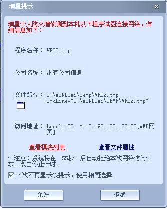 症状:只要连上网络,防火墙提示(如下图)。可疑程序,禁止了!