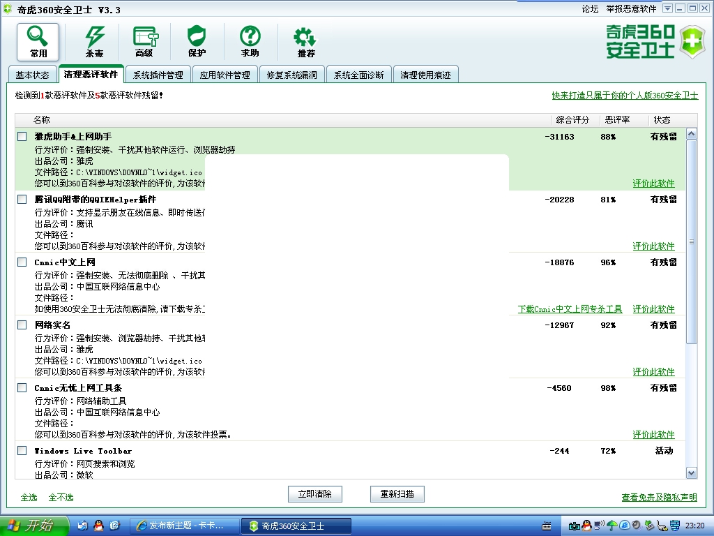 一直使用瑞星系列和超级兔子以为很得意,想不到对一些流氓软件的清除还不到位,刚刚安装了360安全卫士,清理恶评让我吓了一跳,原来以前清除的部分流氓软件还有残留,抓了图跟大家分享,希望没用过360安全卫士的真得下一个清理清理。