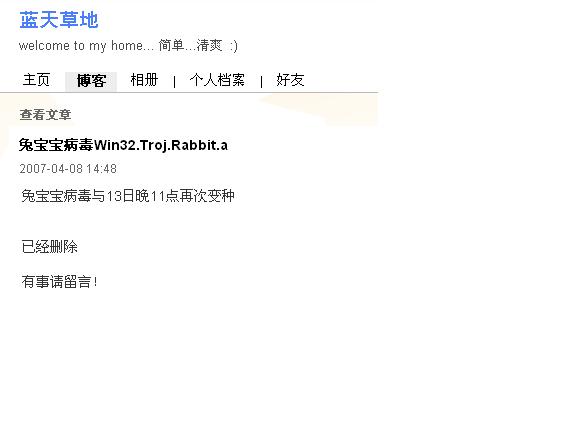 2、“悲伤公子”只是虚幌一枪。beecool那个网址,现在(2007-04-14 14:36)依然能下载Rabbit.exe。这类垃圾人物的人品——————大家心里应该有数。严重鄙视这种心理BT的家伙。