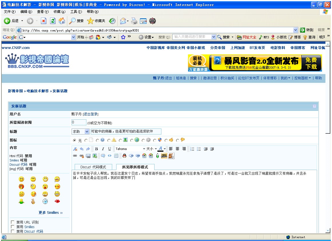 我在这里发个日志,希望有高手指点,我把瑞星杀完在拿兔子清理了是没了,可是过一会就又出现了瑞星就提示又有病毒,并且杀掉,可是还是会在出现,我的IE都变样了