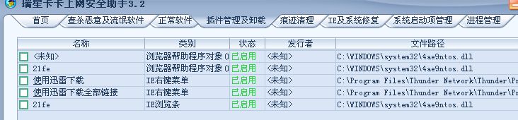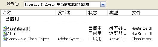 无论进入安全模式还是正常进入,使用卡巴斯基和卡卡都无法删掉进程为21fe、4ae9ntos.dll的加载项,绑定的http://www.45so.com/还会自动下载各类广告插件和流氓插件(最新一次查杀还发现了病毒),每隔几分钟使用卡卡扫描,都能发现新安装进来的恶意插件
