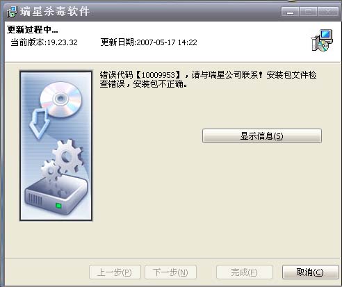 今天的瑞星升级不了,提示安装包错误,错误代码:(10009953)请教是什么原因.
