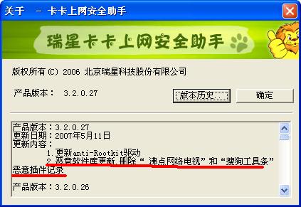 我对卡卡非常失望,在使用扫描流氓软件的时候我被告知没有流氓软件.但很可惜,在我用优化大师自带的流氓清除工具扫描时候我被告知有两个流氓软件!一个是什么"U88财富快车",另一个是"搜狗"这个大垃圾!对于搜狗这个大垃圾我劝你们最好把它列为垃圾流氓软件,因为我没有装它而导致我整个系统运行速度变慢,我差点以为自己中了什么高级病毒了呢!