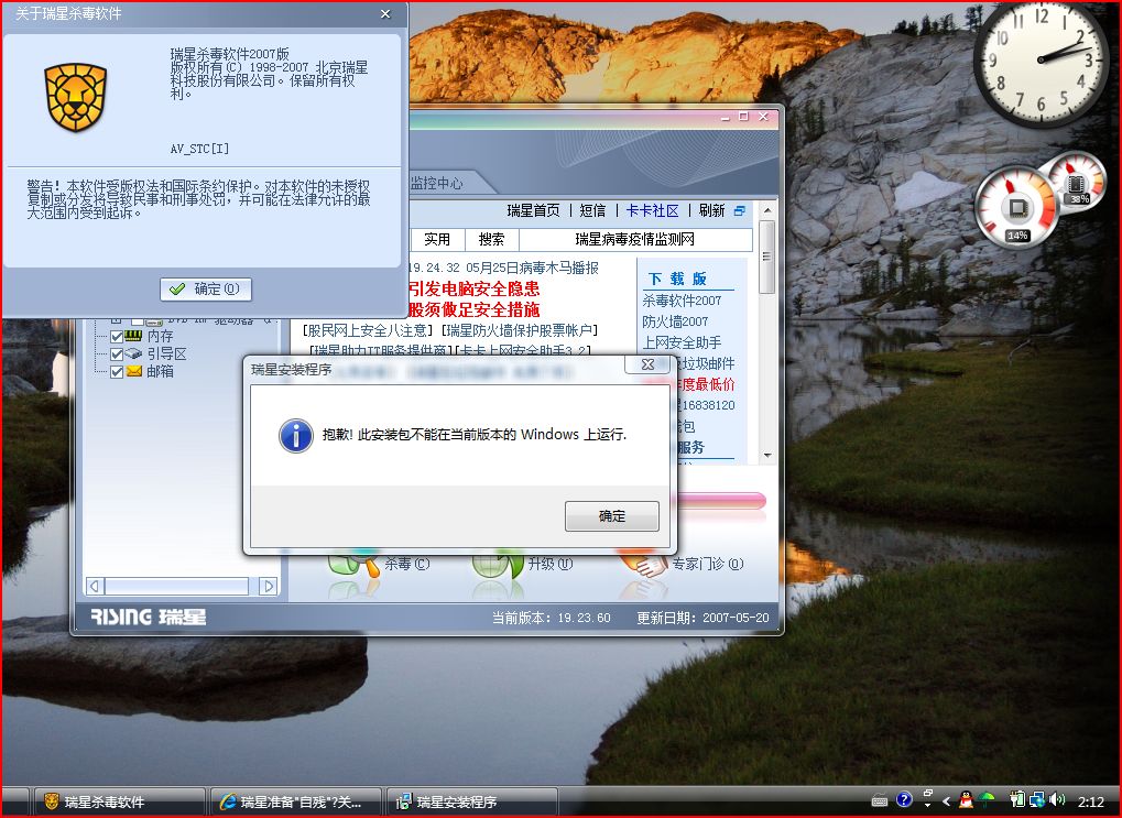 靠!难得支持下国产杀毒软件就这效果???我笔记本和台机都用了瑞星,都是vista系统,笔记本上的标准版升级就出现无法在该windows下安装别说,在台机上for vista的瑞星也这样,搞什么???标准版和for vista版都无法升级,没新的病毒库,是不是一定要我换成别的杀毒软件才开心???