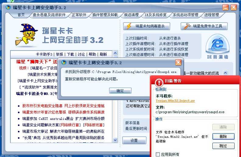 【快讯】5月19日上午,许多卡卡用户向瑞星公司求助:用卡巴斯基杀毒软件杀毒后,瑞星卡卡上网安全助手无法正常升级。经过瑞星研发部门的测试分析,发现卡巴斯基杀毒软件,把瑞星卡卡的升级组件识别为病毒,并将其彻底删除,导致瑞星卡卡无法升级。同时,当卡巴斯基杀毒软件的实时监控功能开启时,用户即使重装瑞星卡卡,其升级组件也会被继续杀除,导致该产品无法升级。