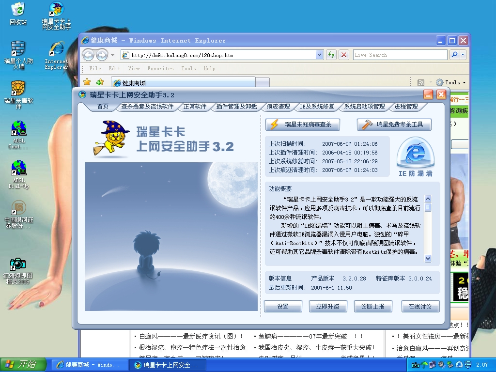 大家好,我是瑞星的忠实用户。当我今天打开“瑞星卡卡助手”和“瑞星防火墙”检查更新时,本应照常显示的“瑞星资讯”网页却没有显示,取而代之的是这个名为“健康商城”“http://dm91.kulong8.com/120shop.htm”兜售性保健品的网页。而且,我的瑞星卡卡选择升级后会显示“获取文件列表失败”而不是平时的“已经是最新版本,不需要更新”。