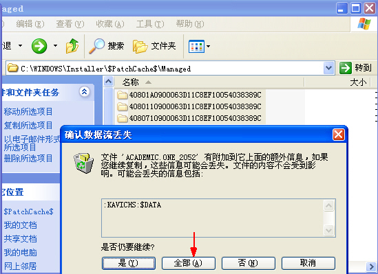 将含有NTFS数据流文件的所有文件夹拖拽到FAT32格式的D分区时,系统报告:数据流文件将丢失。此时,点击“全部”即可。