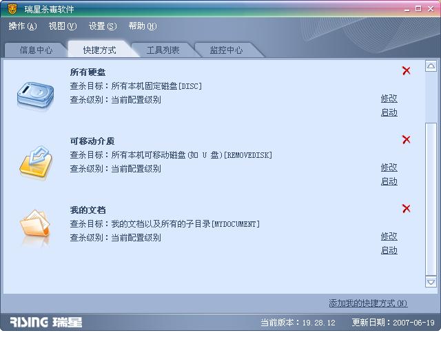 打开瑞星主程序,选择快捷方式选项卡,点击对可移动介质后面的启动按钮查杀