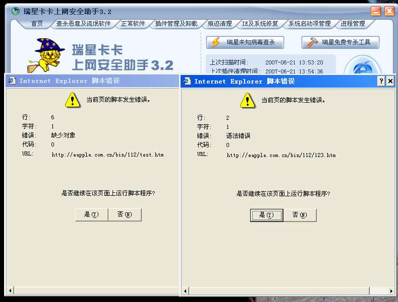 我用了卡卡的“ie及系统修复”功能,显示一切正常,不需要修复。现在是一打开卡卡或者360安全卫士,就弹出下面这样的窗口