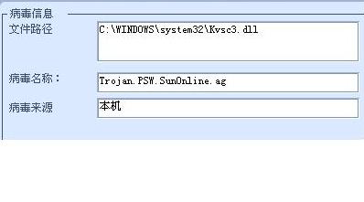 电脑中毒了,用瑞星杀过一遍,上述病毒还在,于是将C盘格式化后覆盖安装,刚启动就跳出一个窗口,瑞星查出来还是Trojan.PSW.SunOnline.ag,但是却杀不了,不知道怎么才能解决掉它?