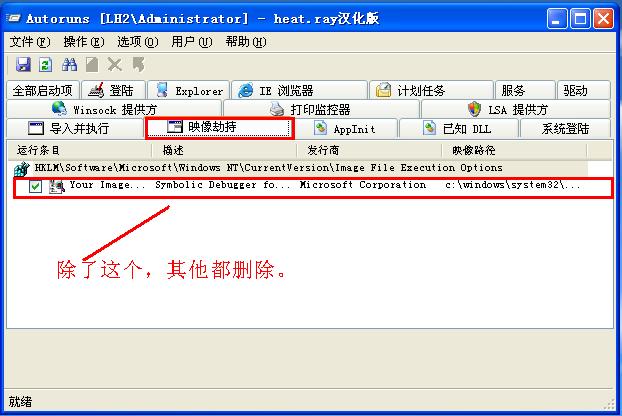 再用你已有的autoruns工具删除映像劫持里的除了下图所示的东西,其他都删除。