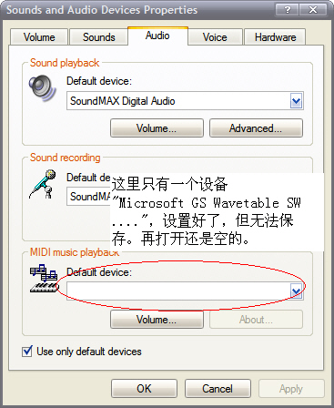 C)在音频选项卡里,midi音乐播放的默认设备为空;