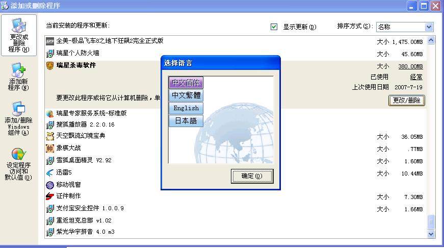 然后我想从装瑞星杀毒软件,我就到控制面版里面去删除这个程序`
