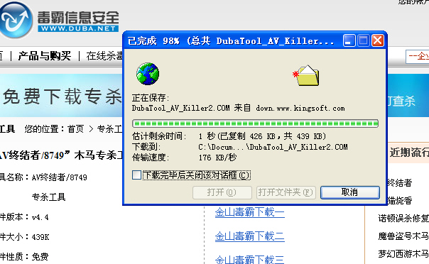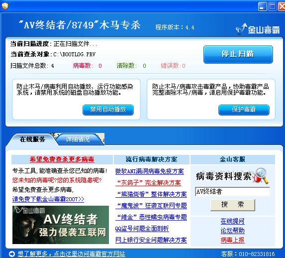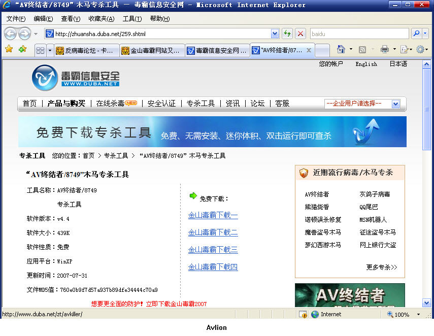 今天(8月2日),我到金山毒霸的官方网站后,进入AV终结者/8749专杀页面中,我的瑞星杀毒软件提示有病毒两个,全是"Hack.Exploit.Agent.cw"这个病毒.我提议千千千万万万不要到金山毒霸的下载AV终结者/8749专杀页面中,否则肯定会中毒.