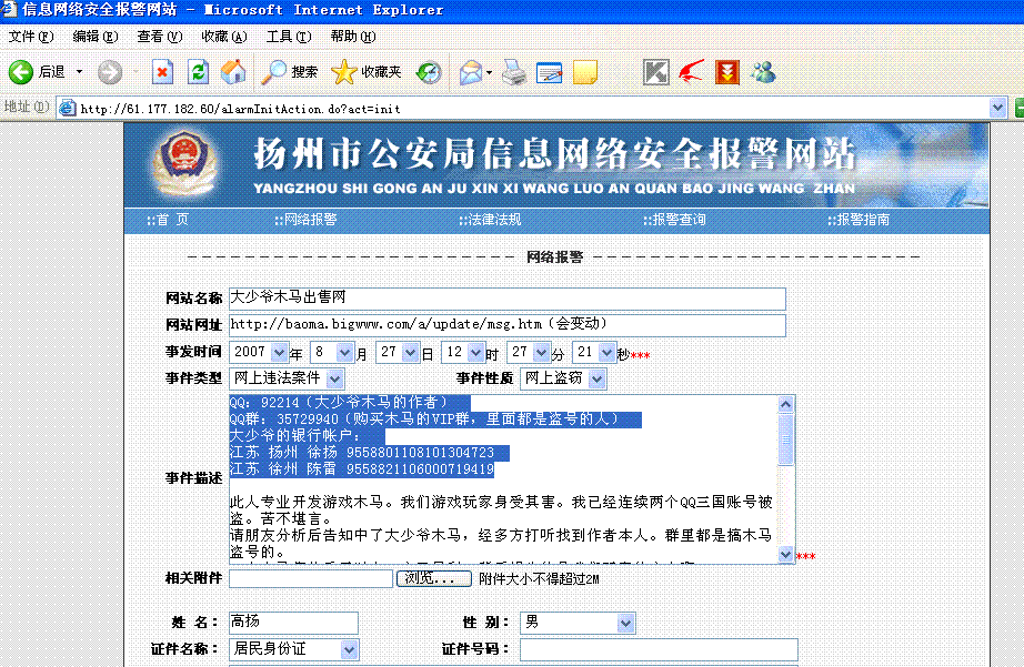 江苏省扬州市公安局网络报警地址:http://61.177.182.60/alarm/pre_alarm.jsp