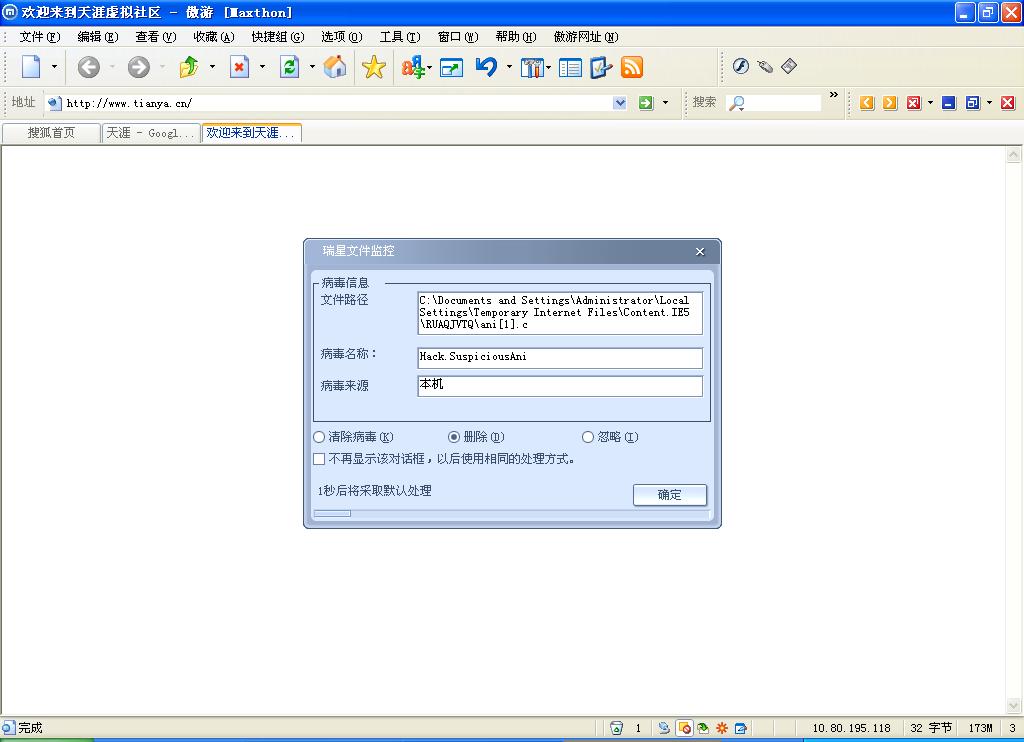 今天一直试图登录天涯(www.tianya.cn),但是每次登录瑞星都会提示网页有病毒。