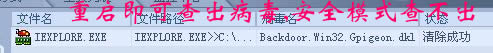上周末可能是浏览网页后中了毒,先是发软现系统会自动更改时间至2099年1月1日,导致很多软件自动出错退出,最后修复注册表后,全部杀掉.但发现重启以后,单扫内存和引导区总会显示有病毒,c:\program files\internet explorer\iexplore.exe有毒,backdoor.win32.gpigeon.dkl,到安全模式下查又显示无毒,可是重新启动后进入正常模式下,一扫又出现了,瑞星显示清除成功,可却怎么也杀不掉!下载了瑞星,金山,江民的灰鸽子专杀,普通和安全模式都查了,却查不出来,真是好奇怪.