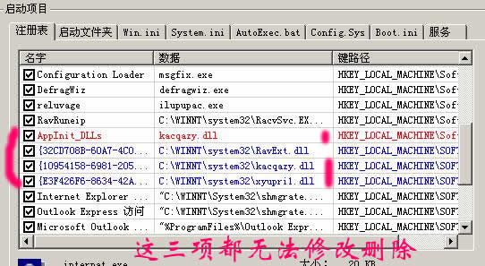 现在机器里有问题的文件:system32\kacqazy.dll  system32\xyupril.dll, 这两个文件为什么删不了呢?怎么才能除掉它们呢?我很着急,都好几天了,搞得什么也做不成,请帮助!谢谢!