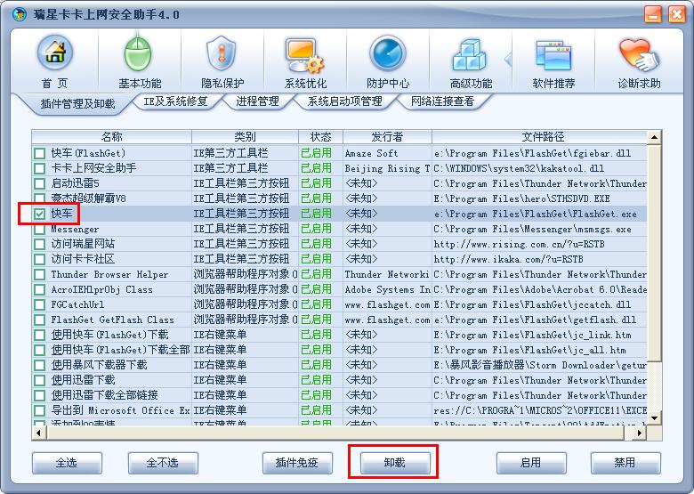 给列表中需要删除的项目名称前打勾,点下方的“启用”(针对恢复使用一些已被禁用的插件而言)、“禁用”(针对一些不太清楚的插件而言。若禁用后发现IE出现问题,还可以用“启用”进行恢复)或“卸载”(针对一些确认为恶意或无用插件而言,彻底清除的操作)按钮。“插件免疫”是指被免疫的插件不会被自动在后台安装和运行,主要是用来防止一些流氓插件。