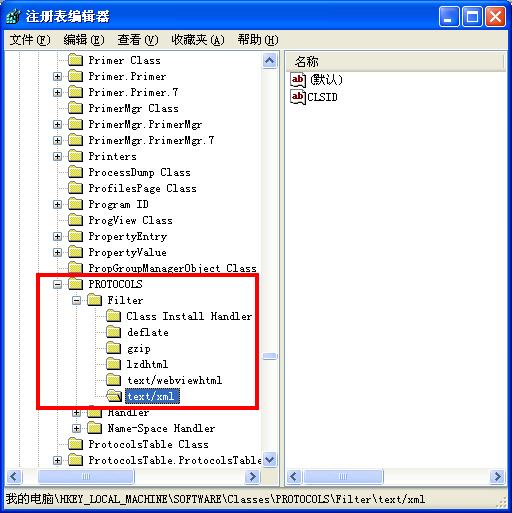 三、展开注册表编辑器左侧窗格的注册表树形目录,定位到[HKEY_LOCAL_MACHINE\SOFTWARE\Classes\PROTOCOLS\Filter]这个注册表项,单击项目左侧的“+”号,展开其子项,找到并删除其下列子项(右键在子项名称上点一下,选择“删除”):