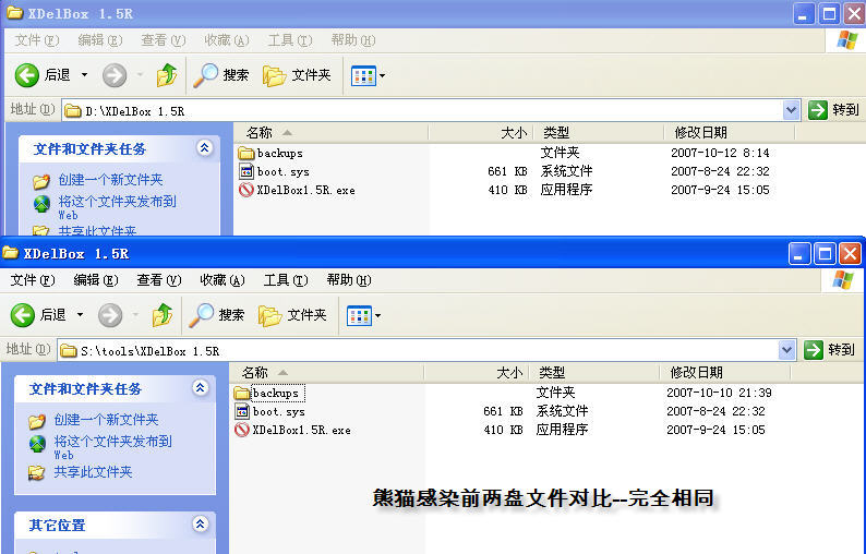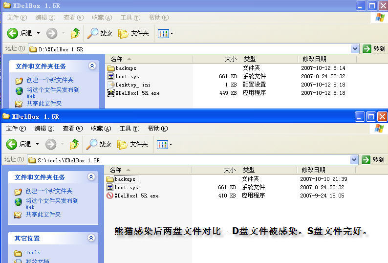 3、关闭所有安全软件。在全影子模式下运行熊猫烧香样本。然后,再次安装S盘,并对比D盘、S盘中的XDELBOX(图6)。