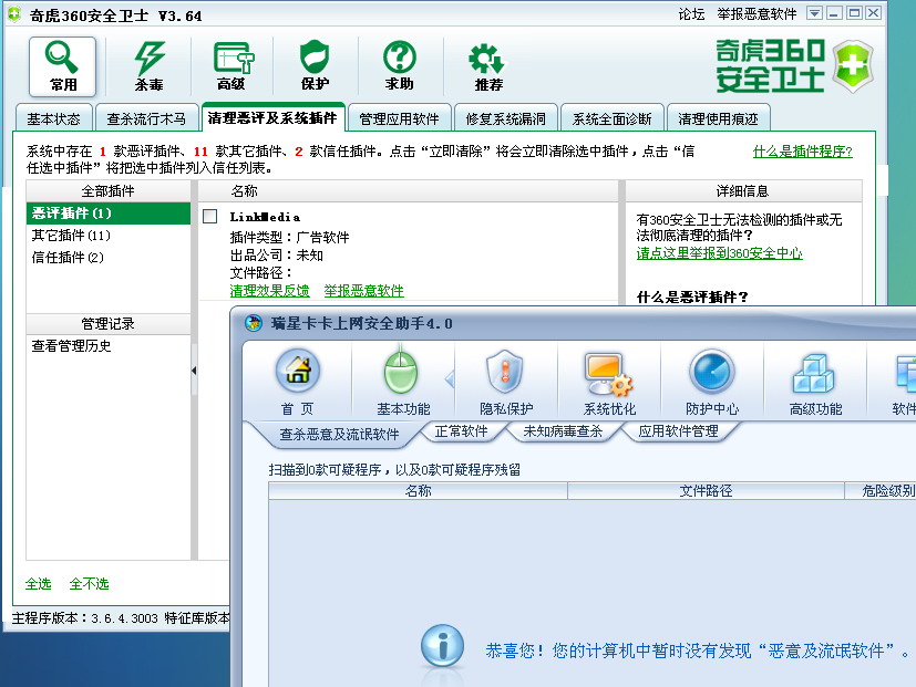 您好,我是瑞星的正版用户,前段时间使用电脑时候莫名其妙的多次出现explorer的报错,然后桌面图标与任务栏都消失后再出现,如果此时用win键+L来锁定计算机,瑞星的在左上角的图标也会遭到破坏(因为上传的内容只能一个,因而只截取了用360安全卫士能找出来的图),是指linkMedia的插件,目前升级了瑞星2008后,仍然无法查出改木马或插件,因此希望贵公司能给予我帮忙或建议。附件中为查出插件的截图