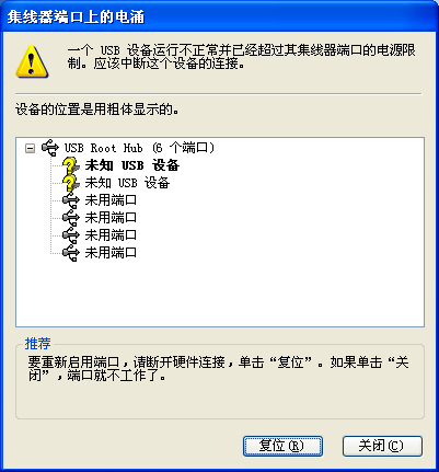 主板USB端口供电不足,可以用自带电源的USB-HUB集线器解决。