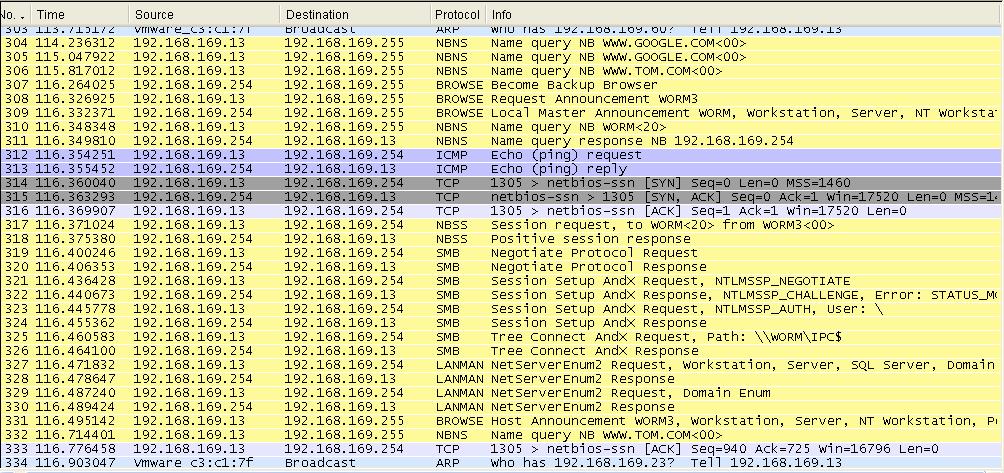 这是我用wireshark截的一台中熊猫烧香的机子在局域网中的数据流,应该是它感染另一台机子的过程吧,请问谁能给我照着稍微解释一下其工作原理吗?谢谢