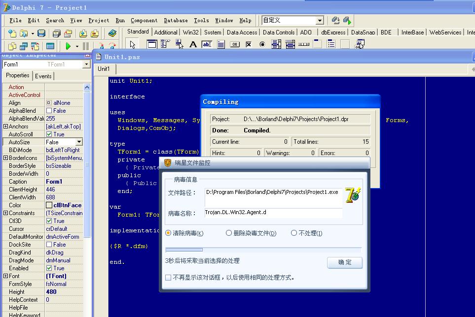 Delphi7中如果引用ComObj单元后编译,瑞星就提示有病毒(20.22.51)