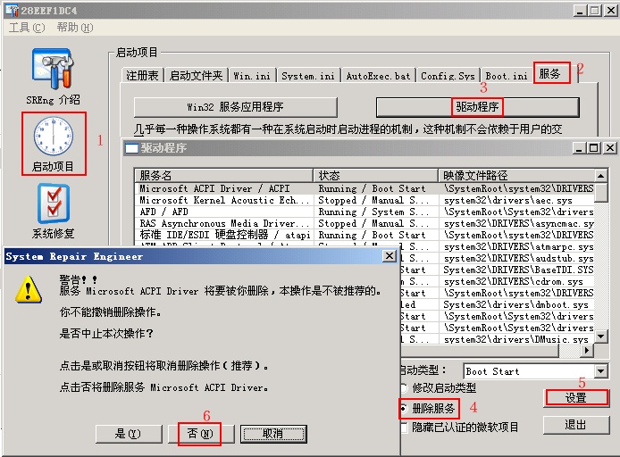 删除驱动就用你扫描日志的那个工具,打开以后选择【启动项目】-【服务】-【驱动程序】,选择你要删除的驱动,选择【删除】,点【设置】,然后点【否】