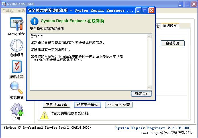 我的安全模式进不了,按F8进入安全模式,屏幕全部是黑的,只有左上角有个"\"光标一直闪动,然后就一直这样.不知道用SREngPS.EXE修复"安全模式",它的警告会有什么风险(入图),会不会用这个修复后,下次开机就有可能存在正常登陆不了系统的危险? 谢谢!