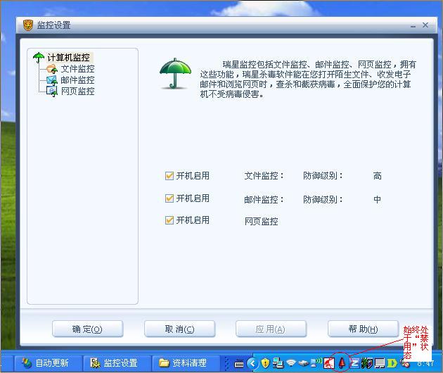 1)但是,瑞星监控功能却处于"所有监控已禁用"状态,打开设置,却发现所有的监控都处于开启状态.