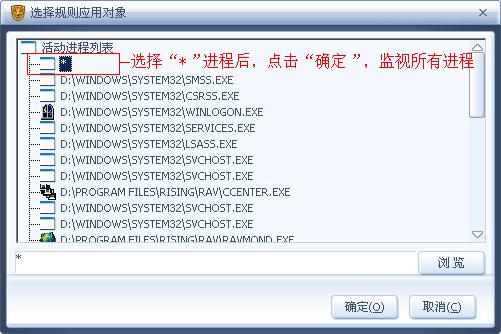 图2:在 活动进程列表 中,选择“*”进程后,点击“确定”,监视所有进程的动作