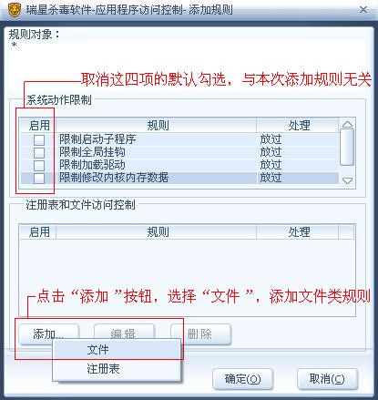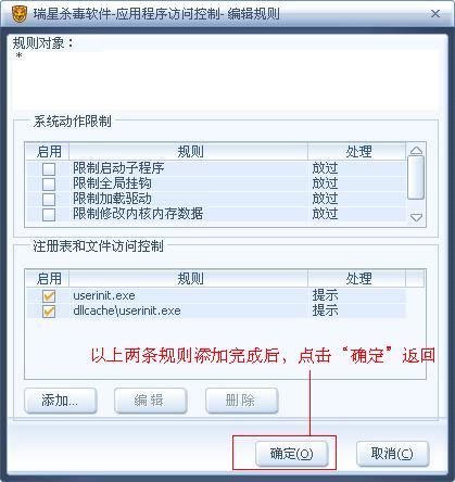 图5:按以上方法,再添加相应规则,保护 dllcache 目录下的 userinit.exe 文件,具体文件路径为,用户当前系统盘符下的 Windows\system32\dllcache\userinit.exe (XP、2003、Vista 系统),Winnt\system32\dllcache\userinit.exe 文件(2000 系统)