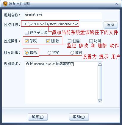 监控目标处:点击“选择”按钮,可以浏览磁盘文件,选择用户当前系统盘符下的 Windows\system32\userinit.exe 文件(XP、2003、Vista 系统),Winnt\system32\userinit.exe 文件(2000 系统)