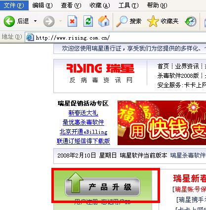 登陆http://www.rising.com.cn/,点下图红框处的地方,输入你的ID及SN,进入相关镜像文件下载界面后,先仔细看完说明,然后下载相应的升级安装包(建议不要用下载工具下载,直接用系统自带的“另存为”),然后双击所下载的安装包即可升级到2008。