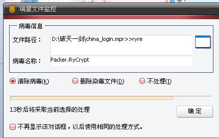 但是2天后我玩这个游戏的时候发现了Packer.RyCrypt的病毒,同时我进行了卸载,从新的安装,发现还是1样的效果。对话框如下: