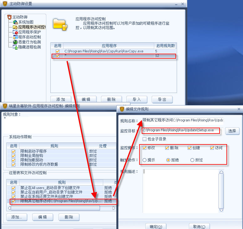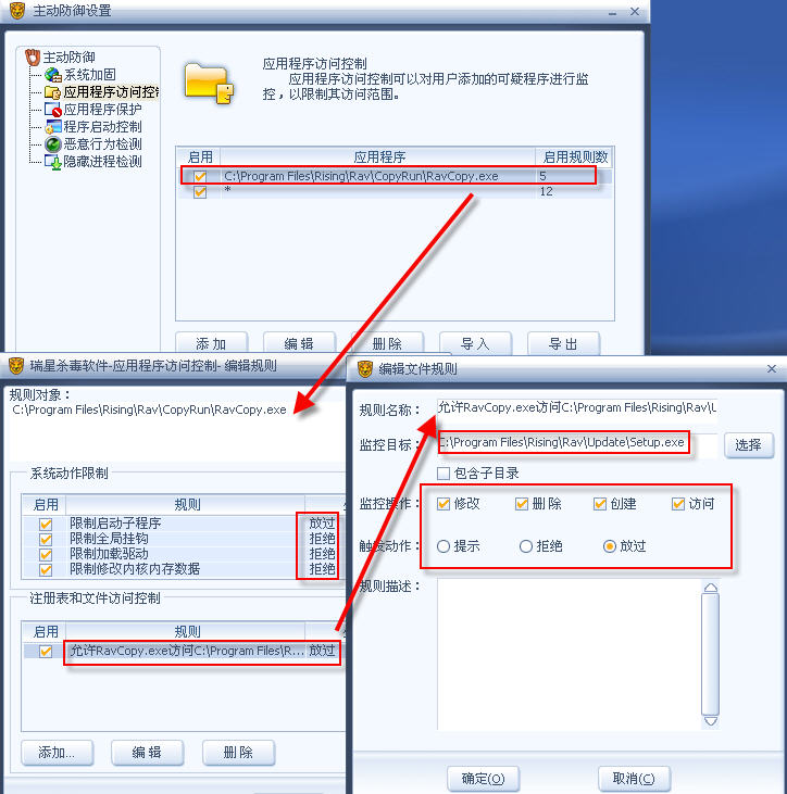 1、在瑞星2008“主动防御”的“应用程序访问控制”中增加两条规则即可。其中,第一条为“允许RavCopy.exe访问C:\Program Files\Rising\Rav\Update\Setup.exe”(图1)。