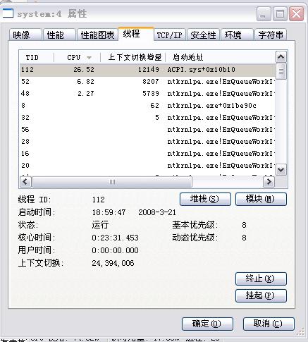 我用 Process Explorer 查看了 System 属性,是 ACPI.sys 造成的,将它挂起后,CPU就下来了。