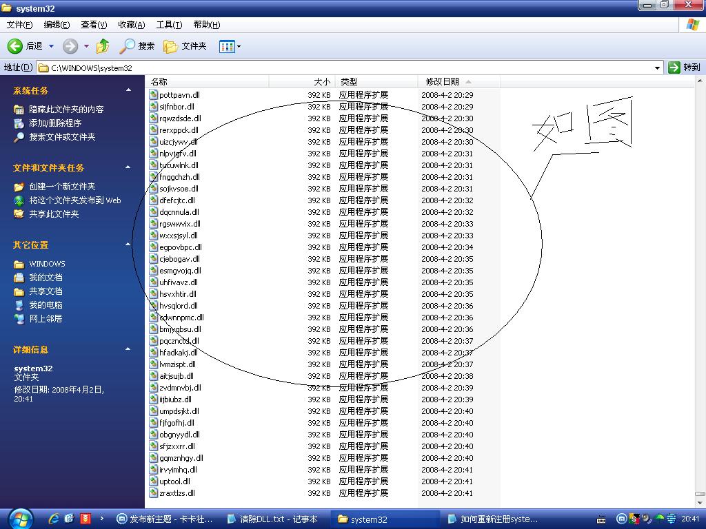 在我的电脑中随机产生的字母组合文件名的病毒生成在c:\windows\system32下,全是dll文件.很多,C盘的磁盘空间快占满了。