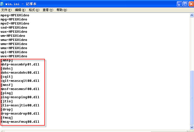 1、打开windows目录下的win.ini,删除下列内容(见图1红框)。保存。