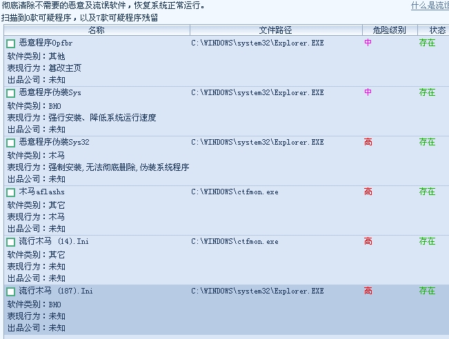 卡卡清除不了,杀毒软件以杀掉不到,不知为何?早上上网时感觉不太合适,先用全盘扫描后没发现病毒,用卡卡发现了7个恶意及流氓软件,可全选清除后,重启后又有了,总是清除不了.下面是卡卡扫描的图