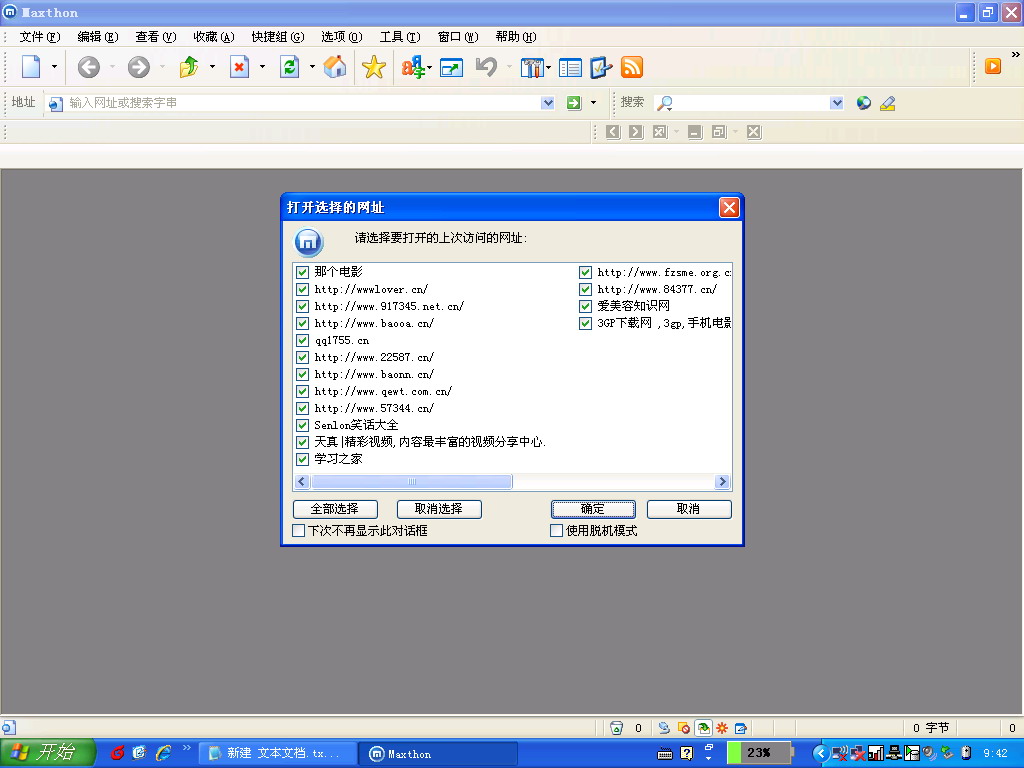 3、经常在我打开maxthon时显示,在上次有不正常关闭的网页--一大堆什么 www.lover.cn之类的网站,一看就知道是垃圾网页(见附件的图)