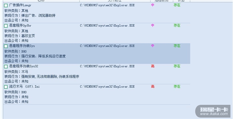 用卡卡上网安全助手5.2查杀恶意及流氓软件得出如图结果,但是怎么清除也清除不了。进入安全模式甚至启动不了瑞星杀毒。到此求救。谢谢