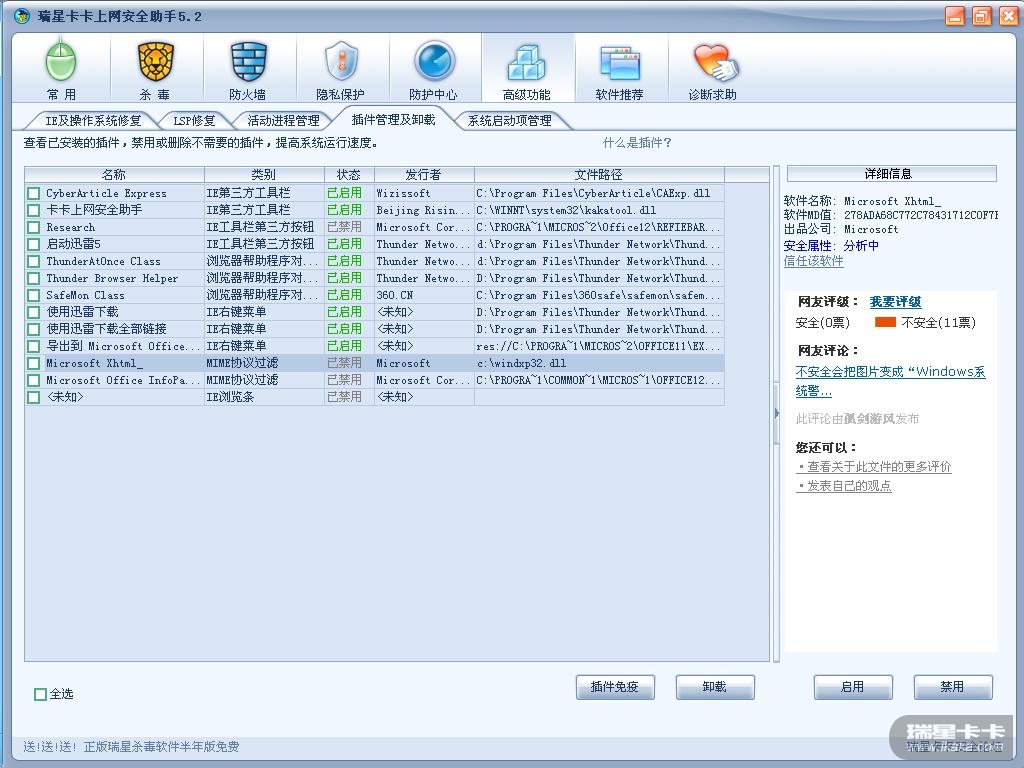 我这个怀疑不是什么恶意网站,用瑞星卡卡安全助手诊断ie插件的结果是一个插件(图片上鼠标指的位置,它的确调用了c盘根目录的一个叫做“windxp32.dll”的文件),这个插件好像是我机器安装Visio2007后的一个补丁包“Visio2007用的XMLLite”里边是补丁“WindowsXP-KB915865-v11-x86-CHS.exe”后产生的,用卡卡把它禁用后,打开baidu或者google等搜索引擎就不会出现的多出来的广告页了。