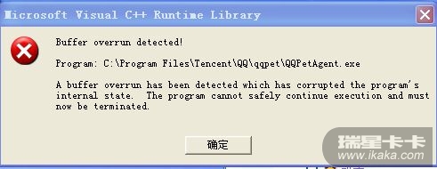 没时间弄QQ宠物那些东西,从对话框的意思来看,QQ宠物程序出现C++库的缓冲溢出错误,使该程序内部状态不稳定,程序无法安全运行而被迫终止。