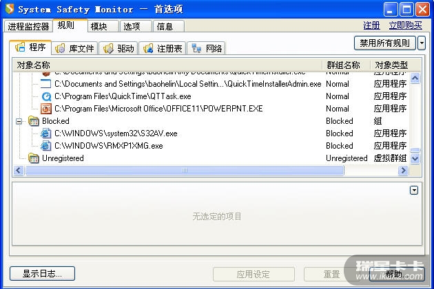 如果系统中安装了SSM等HIPS,用户会得到提示“存在无规则进程”。此时,将C:\WINDOWS\RMXP1XMG.exe和C:\windows\system32\S32AV.exe两个程序归入 "blocked"组(见附图),进程即刻被终止。
